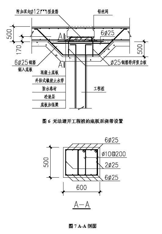 為保證橡膠止水帶的連續(xù)性,將無法避開的工程樁進(jìn)行下沉式處理,下沉高度為500mm。同時設(shè)置一道底板加強(qiáng)梁,以保證無法避開的工程樁與結(jié)構(gòu)底板的連接。在加強(qiáng)梁中后澆帶位置處設(shè)置兩排φ25 鋼筋排焊剪力板,使加強(qiáng)梁后澆帶位置的混凝土能與底板后澆帶共同作用。如圖6、圖7 所示。